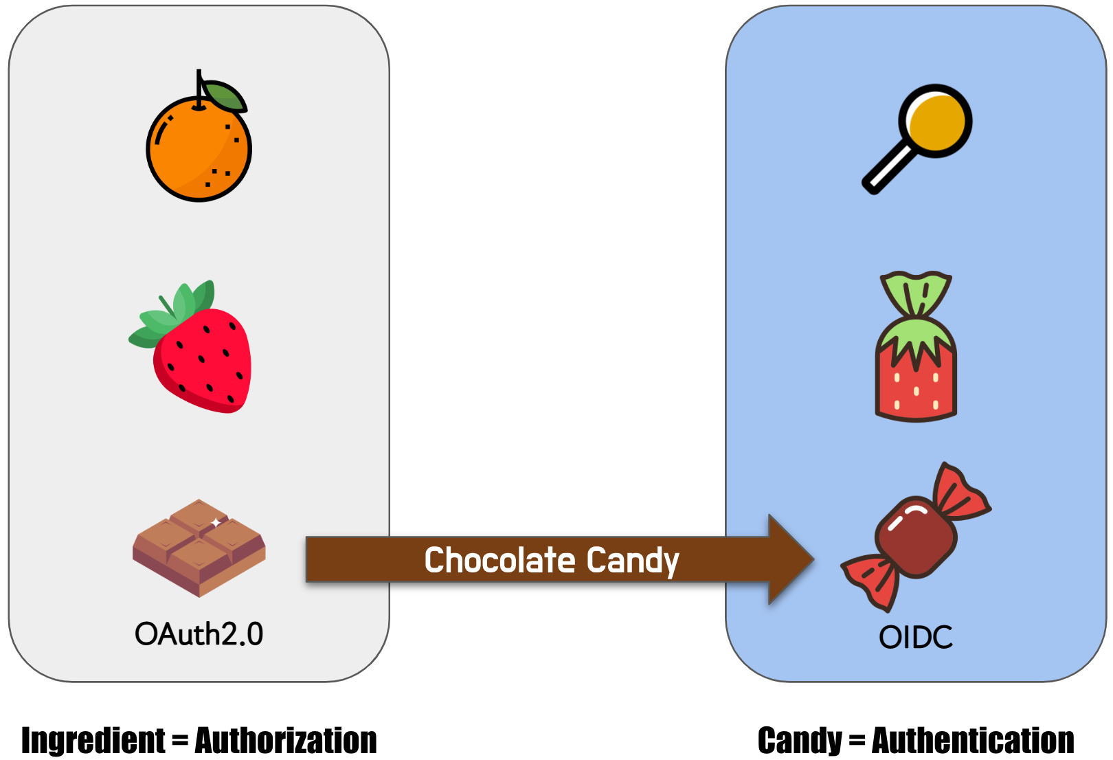 이 비유에서 사탕의 맛을 내기 위한 재료들은 인가(authorization)를 구현하기 위한 여러가지 기술 또는 프로토콜이라고 할 수 있습니다. 그 중 가장 대중적으로 쓰이는 프로토콜이 바로 초콜릿, OAuth 2.0입니다. 그리고 초콜릿은 그 자체로 간식으로 먹는 것처럼 OAuth 2.0도 인가의 기능을 그 자체로 담당할 수 있습니다. 한편 사탕은 인증(authentication)을 구현하기 위한 기술 또는 프로토콜입니다. 특히 OIDC는 OAuth2.0에 기반을 둔 대표적인 프로토콜인데요, 일명 초콜릿 맛 사탕이라고 할 수 있겠습니다.