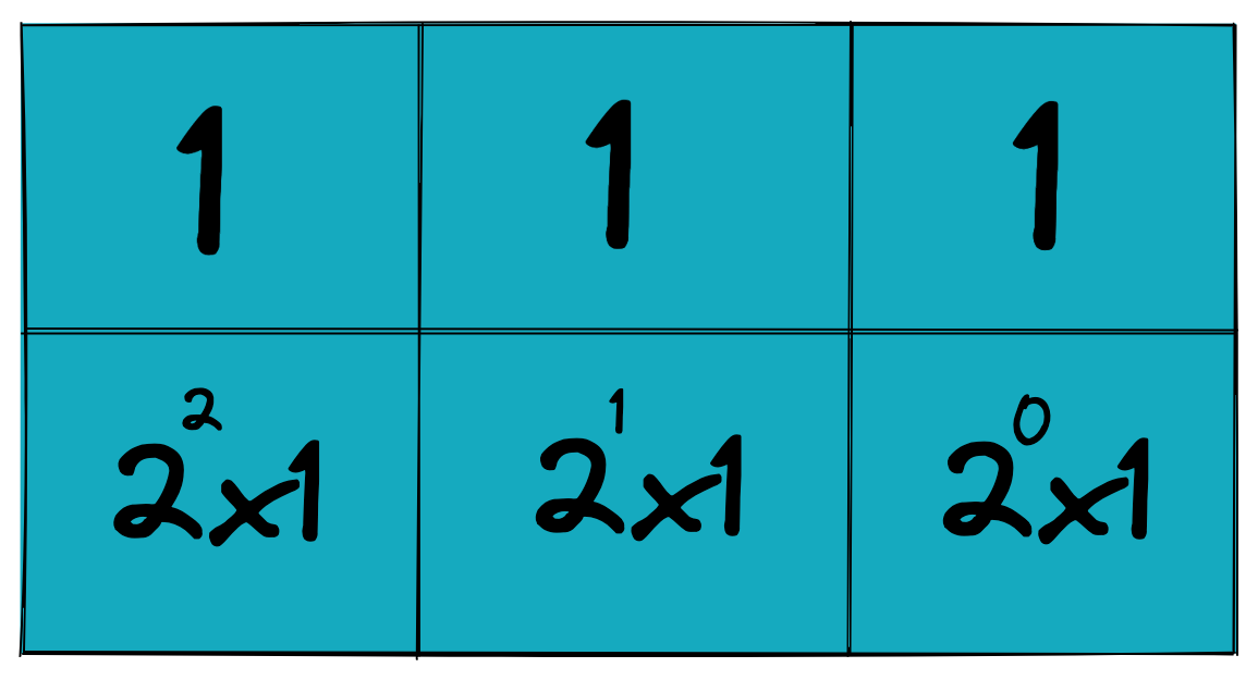 그리고 \(2^3\) 자리수 1, \(2^2\) 자리수 1, \(2^0\) 자리수 1을 이어 붙이면 \(111\)이라는 수가 나타납니다. 즉 십진법 13은 이진법 111로 표현되는 것이죠. 두 수는 수의 시스템이 다를 뿐 완벽하게 같은 숫자입니다. 따라서 우리가 10진법으로 생각하는 모든 수는 2진법으로 표현할 수 있습니다. 따라서 컴퓨터는 0과 1만 이용하더라도 매우 큰 수를 표현할 수 있게 되는 것이죠.