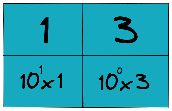 \(13\)은 \(10^1\)자리수와 \(10^0\)의 자리수로 분리해서 생각해볼 수 있습니다. 중요한 점은 십진법에서는 숫자를 \(10\)의 거듭제곱으로 표현하고 있다는 것입니다. 그리고 \(10^1\) 자리수인 1과 \(10^0\) 자리수인 3을 이어 붙여서 \(13\) 이라는 숫자로 나타냅니다. 이 것이 숫자를 10진법의 시스템에서 표현하는 방법입니다. 10진법은 숫자를 0~9를 활용해서 표현합니다.